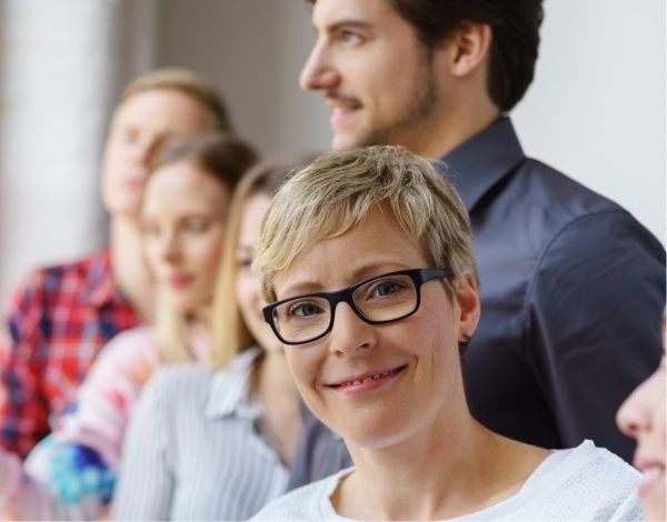 Porträt junge Frau schaut aus einer Gruppe lächelnd in die Kamera